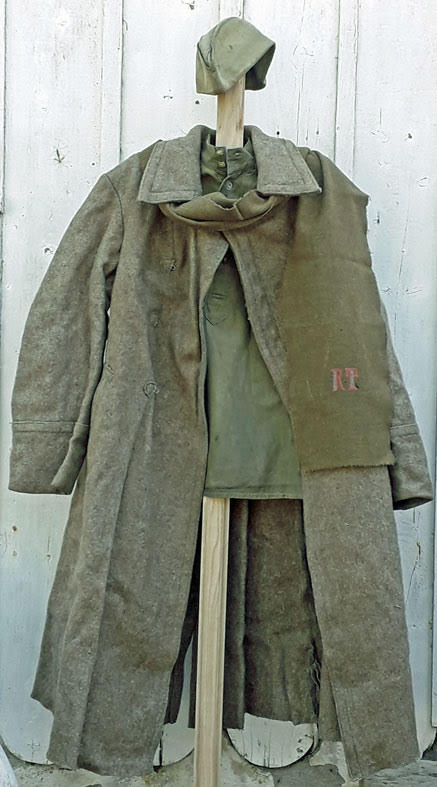 La capote, la chemise et le calot sont soviétiques, l’écharpe coupée dans une couverture, brodée aux initiales du PG et la gamelle sont françaises… |