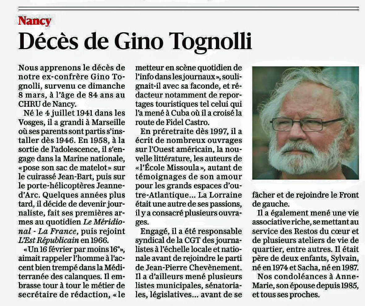 A l’actif de Gino, il faut ajouter la publication d’une demi douzaine de beaux livres consacrés tant à la « Lorraine de nos grands-parents » qu’à l’Ouest américain. Il était intarissable lorsqu’il évoquait l’aventure de Buffalo Bill en Lorraine ou l’expédition de Lewis et Clark aux Etats-Unis.