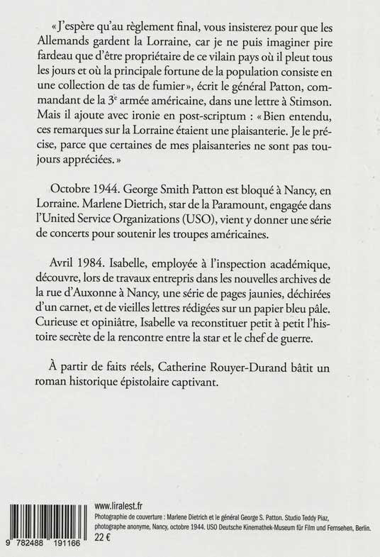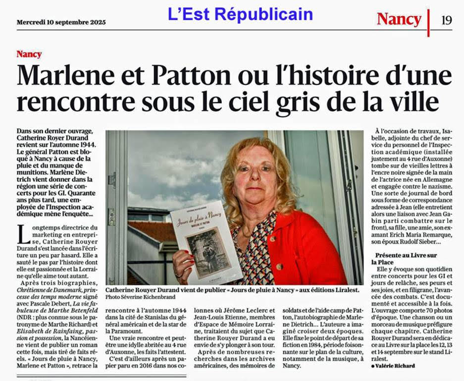 Surprise pour Catherine Royer Durand venue présenter son dernier roman « Jours de pluie à Nancy, Marlene et Patton ». Un roman abondamment documenté, fruit de deux années de recherches assidues dans les différents sites d’archives, et dans la riche bibliographie consacrée à ces deux personnages mythiques. A consommer sans modération pour qui veut se plonger l’espace de quelques heures dans ce dernier trimestre de l’année 1944 à Nancy, et plus particulièrement au numéro 4 de la rue d’Auxonne … Une multitude d’informations à découvrir ou à redécouvrir pour revivre au plus près cet épisode trop longtemps et injustement oublié de la libération de la cité ducale, de la Lorraine et… de la France.