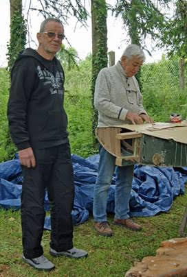 ![]() Les travaux de réparation de l’aile, un travail minutieux réalisé par Christian sous l’œil expert de son ami arrivé du Brésil… |