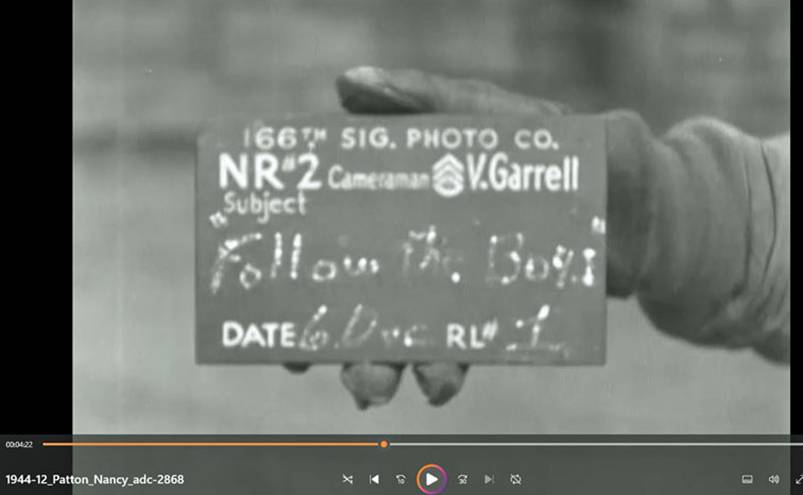 | DECOUVERTE par Damien NICOLEDI qui travaille au Musée Lorrain de cette vidéo conservée aux Archives militaires américaines dans laquelle on peut voir plusieurs séquences consacrées à Patton à Nancy au début du mois de décembre 1944 ! Reférence du film NARA : 111-adc-2868.MP4 (156 Mo) Durée totale : 10 min Patton, caserne Molitor : à 4.20 min Patton, hôpital Sédillot : à 6.40 min Patton, rue d'Auxonne : à 7.20 min |