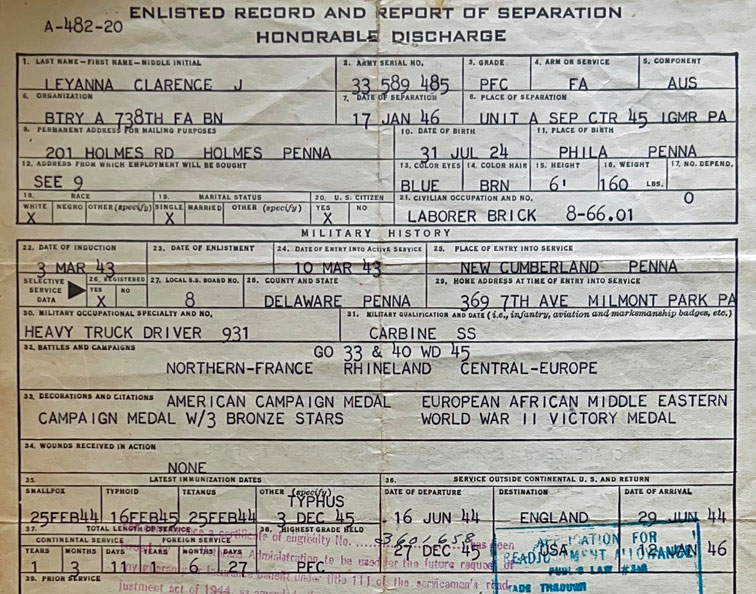 Le PFC Clarence J LEYANNA, et son épouse Martha L LEYANNA décédée le 29 juin 2015 reposent dans le Delaware Veterans Memorial Cemetery.