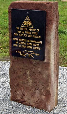 Inaugurée le 10 septembre 2011 la stèle érigée en l’honneur de Ruben RIVERS du 761st Tank Batallion tombé le 19 novembre 1944 |