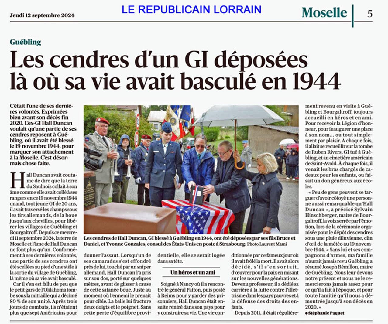 Organisée à l’initiative de Sylvain Hinschberger, maire de Bourgaltroff, et de Joseph Remillon, maire de Guebling, une très belle et très émouvante cérémonie s’est déroulée le 11 septembre dernier à proximité de la stèle érigée en l’honneur de Ruben Rivers, un tankiste du 761st Tank Bataillon, lui aussi originaire d’Oklahoma, tué au combat le 19 novembre 1944.