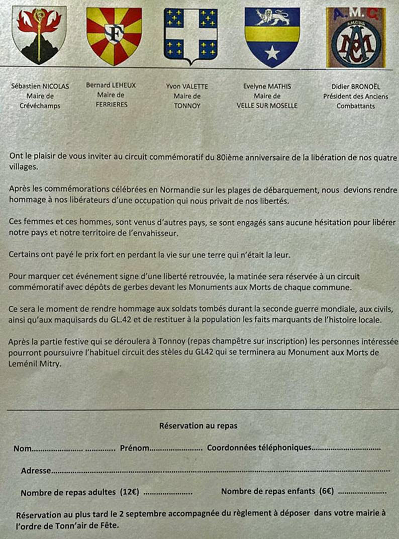 Cérémonies à Crevéchamps, Ferrières, Tonnoy et Velle-sur-Moselle
