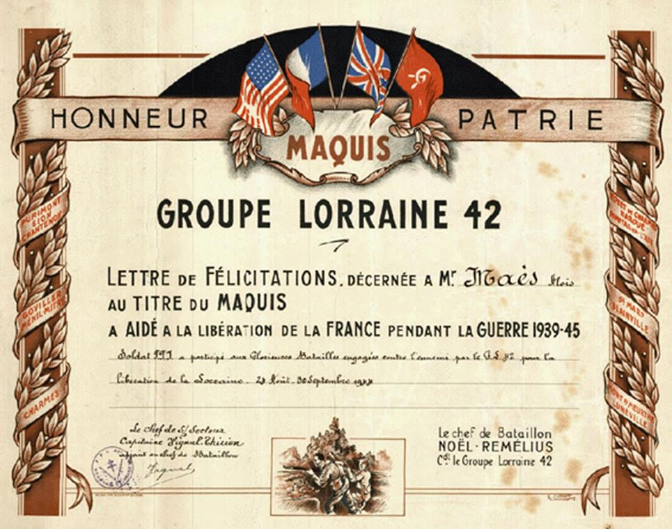 page Lorraine que nous ne devons pas oublier. » Le diplôme d’Aloys MAES signé par le capitaine Thirion « Vignal »,