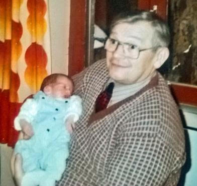 Thomas dans les bras de son grand-père |