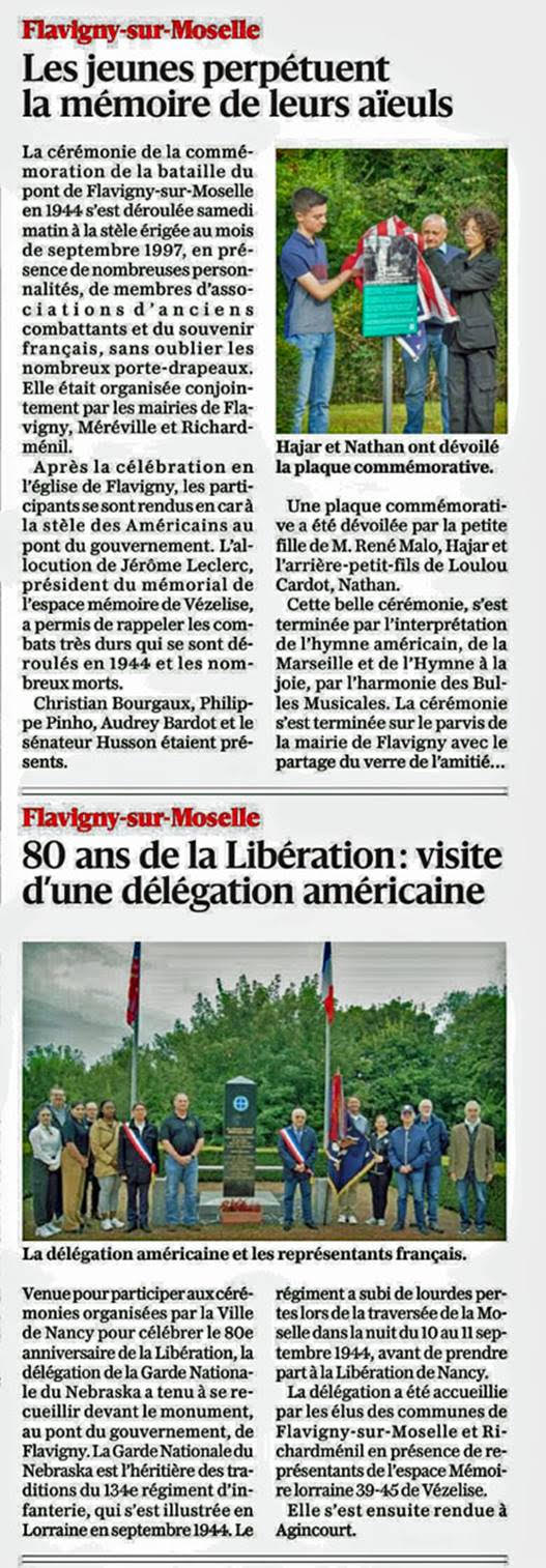 Un beau succès pour cette commémoration, qui, cerise sur le gâteau, avait été précédée, trois jours plus tôt, par la visite d’une délégation de la Garde Nationale du Nebraska, unité militaire américaine héritière des traditions du 134th Infantry Regiment US, venue spécialement des Etats-Unis pour participer aux manifestations organisées pour le 80ème anniversaire de la Libération de Nancy.