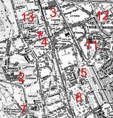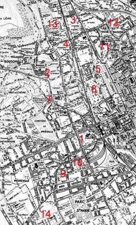 1944. 14 points ont été localisés et reportés sur un plan de Nancy de