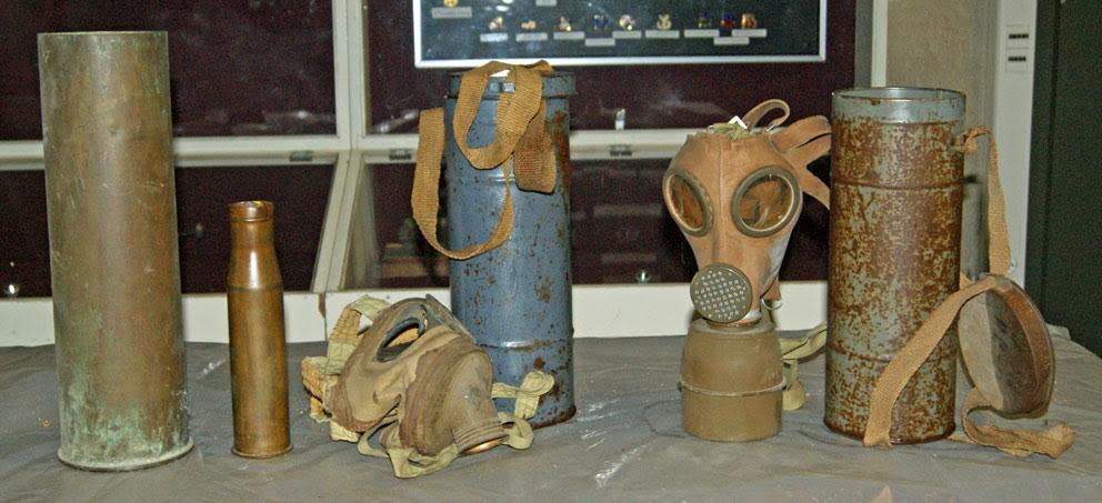 Douilles d’obus US de 37 et 105 mm, 2 masques à gaz de la défense passive