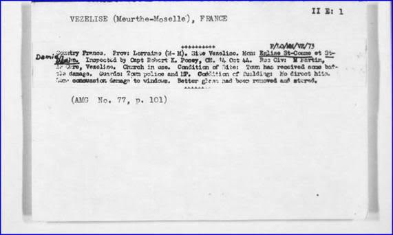 Le compte rendu de la visite de l’église de Vézelise par le Captain Robert K. Posey le 14 octobre 1944NARA M1944. Records of the American Commission for the Protection and Salvage of Artistic and Historic Monuments in War Areas, 1943-1946. http://www.fold3.com/image/