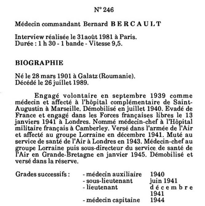 ![]() Docteur Bernard BERCAULT, 28 mars 1901 – 20 juillet 1989 engagé dans les FFL le 13 janvier 1941, FAFL le 26 décembre 1941 Médecin Colonel de l'Air, Médecin du groupe de bombardement « Lorraine » Officier de la Légion d'Honneur, Croix de guerre, Médaille de la Résistance, Médaille de la France Libre |