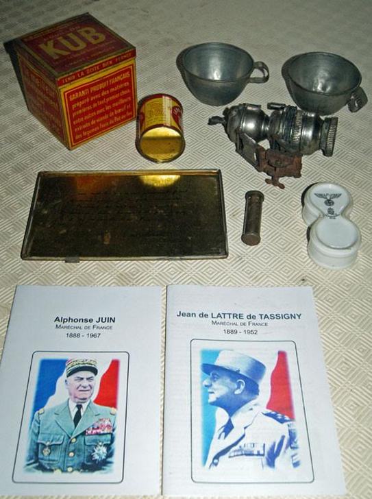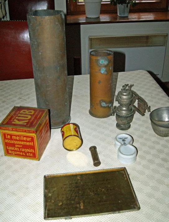 Douilles d’obus, quarts, lampe à acétylène, boites de bouillon, cartes