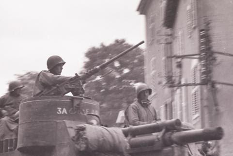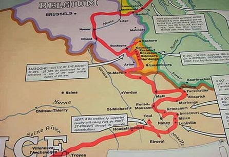 ![]() Carte américaine indiquant le parcours suivi par le 696th Armored Field Artillery Battalion (Etreval !) |