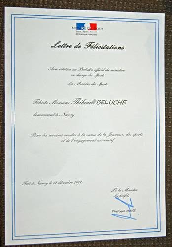 lettre de félicitations de la ministre des Sports, avec citation au