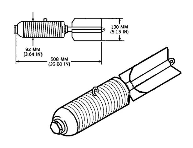![]() ![]() 20lb AN-M41 Weight: 19.9lb/ 9kg Explosive Weight: 2.8lb/ 1.27kg Comp B RE Factor: 1.33 TNT Equivalent: 1.69kg |