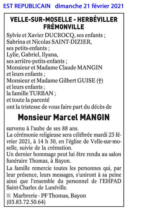 Ses obsèques seront célébrées ce mardi 23 février 2021 à 14h30 en l’église de Velle-sur-Moselle.