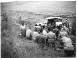 De la proue, on pouvait voir, au loin, la terre, d'où partaient des tirs nourris de l'artillerie allemande. Ce fut seulement au milieu de la nuit suivante que notre tour vint. Je grimpai dans ma jeep qui était chargée dans une barge; mon chauffeur me rejoignit prestement. A cent mètres du rivage, nous mîmes à l'eau notre jeep amphibie. Nous avancions dans des eaux peu profondes; soudain, la jeep ralentit brusquement et sombra dans la vase. Nous avions de l'eau jusqu'au cou. Nous sommes restés dans cette position deux heures au moins, jusqu'à ce qu'une autre jeep vienne nous tirer de là. Nous étions trempés jusqu'aux os. Les combats étaient rudes; nous progressions lentement, mais pûmes atteindre le bourg de Sainte-Mère-Eglise dans la nuit du jeudi 8 au vendredi 9 juin.