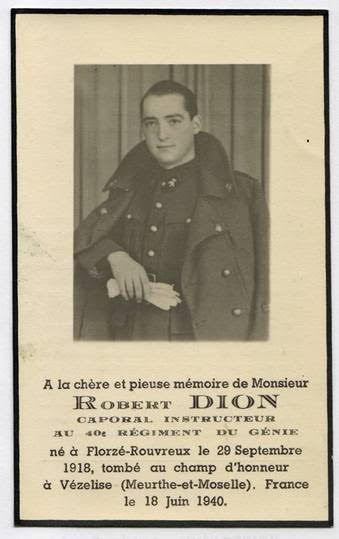 Robert DION Né le 29 septembre 1918 à Florzé-Rouvreux (Belgique) n’avait pas encore 22 ans |