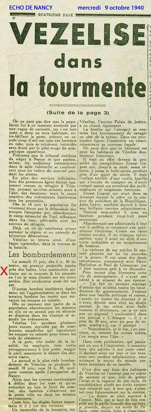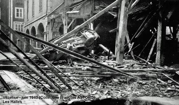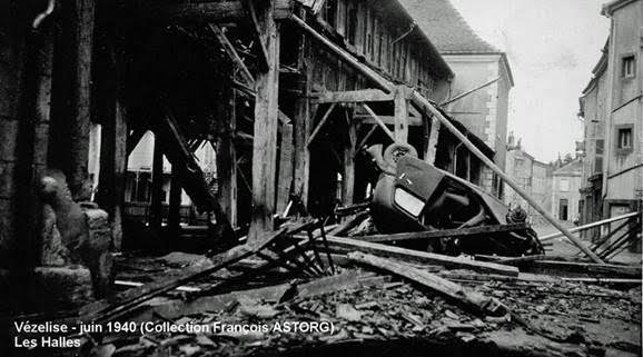 ![]() Photo prise après le bombardement du 15 juin 1940 : au second plan, la façade de l’épicerie d’Henri Leclerc (actuellement bureau de tabac) est intacte |