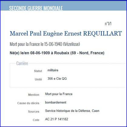 ![]() La fiche de Marcel REQUILLART sur le site Mémoire des Hommes |