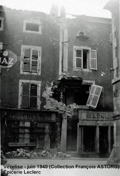 ![]() Sur photo, prise après le bombardement du 18 juin 1940, la façade de l’épicerie d’Henri Leclerc est éventrée et criblée d’impacts |
