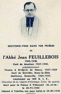 Dans le cimetières de Vézelise, la tombe de l’Abbé Jean FEUILLEBOIS, lieutenant au 168ème Régiment d’Infanterie de Forteresse, tombé à la tête de sa section de mitrailleuse le 20 juin 1940 à Villacourt