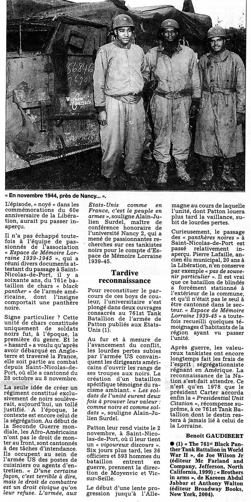 sur l’histoire des hommes du 761st Tank Battalion en Lorraine, il