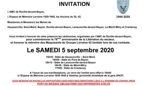 Parfaitement organisé, comme il le fait, depuis sept ans maintenant, par notre ami Roger Laurent, président de la section AMC de Roville-devant-Bayon. le traditionnel circuit des stèles du GL 42 s’est déroulé ce premier samedi de septembre, à Haussonville, Bayon, Laneuveville-devant-Bayon, Leménil-Mitry et Crantenoy.