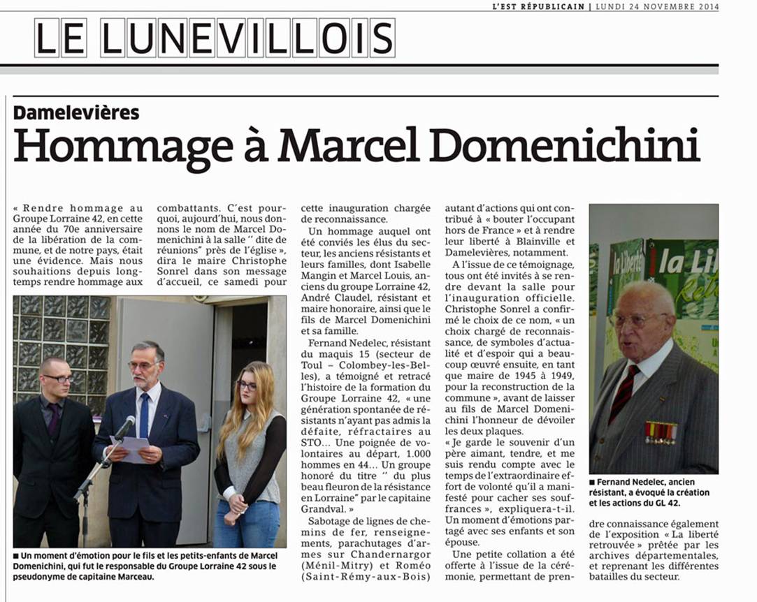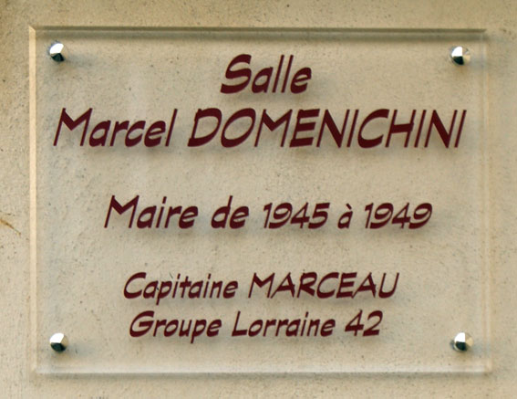 ![]() A l’initiative de Christophe Sonrel, maire et de son conseil municipal, la commune a donné le nom de Marcel Domenichini à une salle de Damelevières. Par ce geste, la municipalité souhaitait marquer le 70ème anniversaire de sa Libération. Un projet qui tenait à cœur de Jean Stempfel, regretté président de l’amicale du GL 42. |