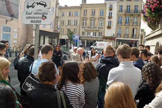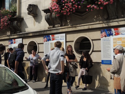 ![]() Sur la façade de l’Hôtel de Ville, les drapeaux français, américain, anglais et russe |
