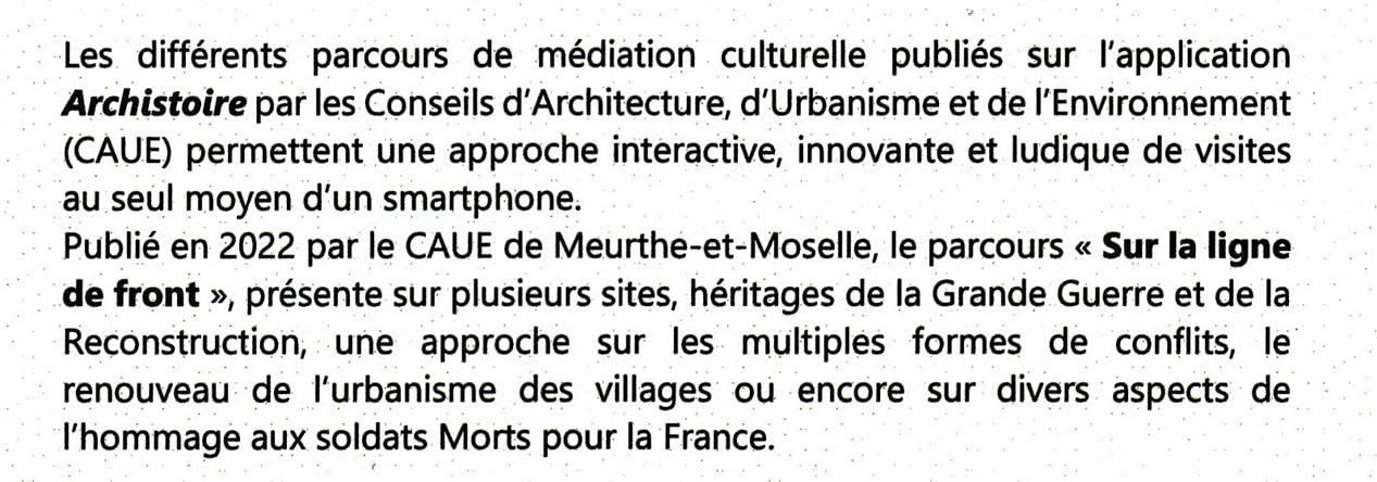 Ce contenu multimédia a été initié avec le concours de la Fédération Nationale des CAUE, lauréate de l'appel à projet "Services numériques innovants destinés au tourisme de mémoire" financé par le Ministère des Armées et conçu en lien avec un nombre important d'acteurs locaux du département.