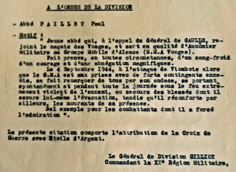 ![]() Les médailles de l’Abbé Paillet ont désormais un visage … Et grâce à notre ami Christophe Lagrange, également le texte de sa citation à l’ordre de la division ayant conduit à l’attribution de sa Croix de Guerre avec étoile d’argent.