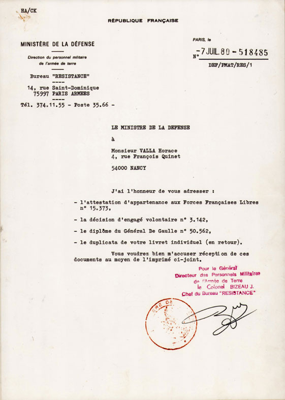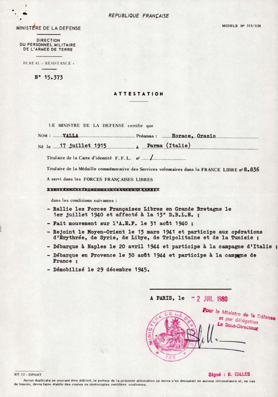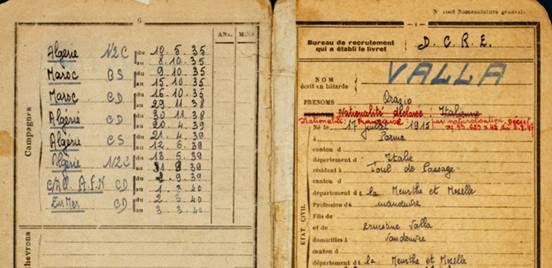 Un début de classement des documents déposés mettait en évidence la valeur de ce fonds. Horace VALLA, le père de Madame Hacquard, est né à Parmes (Italie) en 1915. Sa mère réside à Vandoeuvre. Il n’a pas encore 20 ans lorsqu’en 1935, il contracte un engagement dans la Légion étrangère.