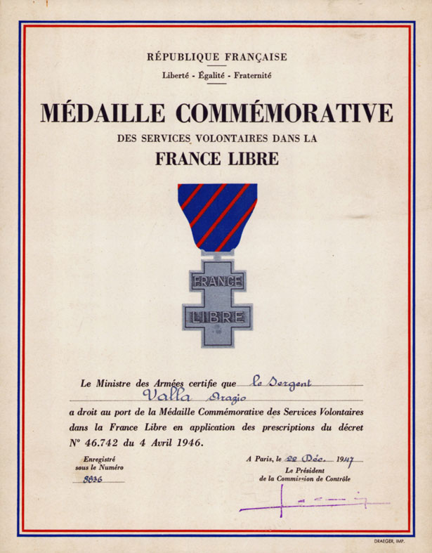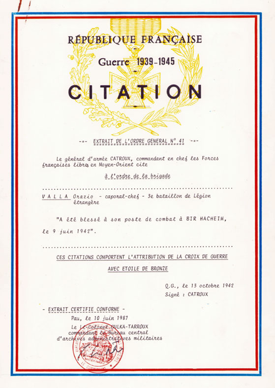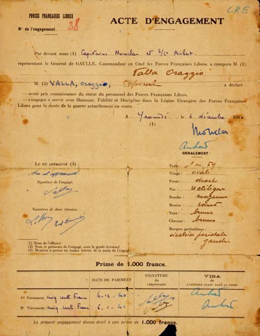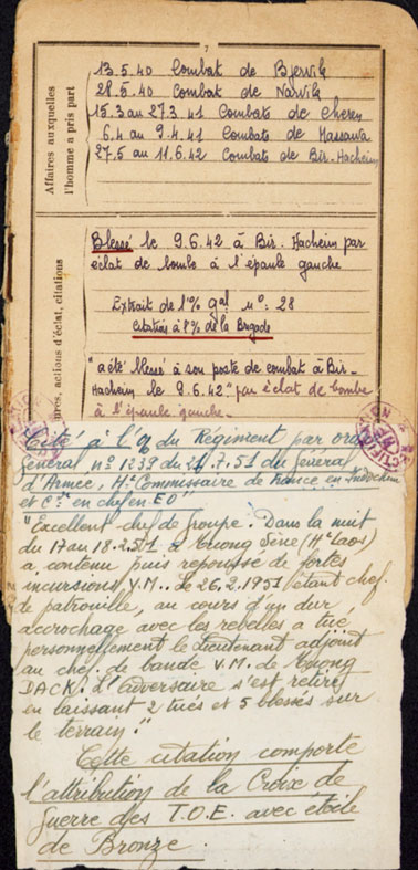 1er juillet 1940, il signe son engagement pour la France Libre. Le début d’un parcours exemplaire, il participe à l’odyssée de la France Libre. Blessé à Bir Hakeim le 9 juin 1942, ses citations et décorations balisent une épopée au service de la France.