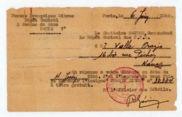 Ce n’est pas un prêt, mais un don, ils nous les offrent. Dans l’importante collection de prestigieuses médailles, sont conservés ses deux insignes numérotés de la France Libre correspondant aux documents classés…