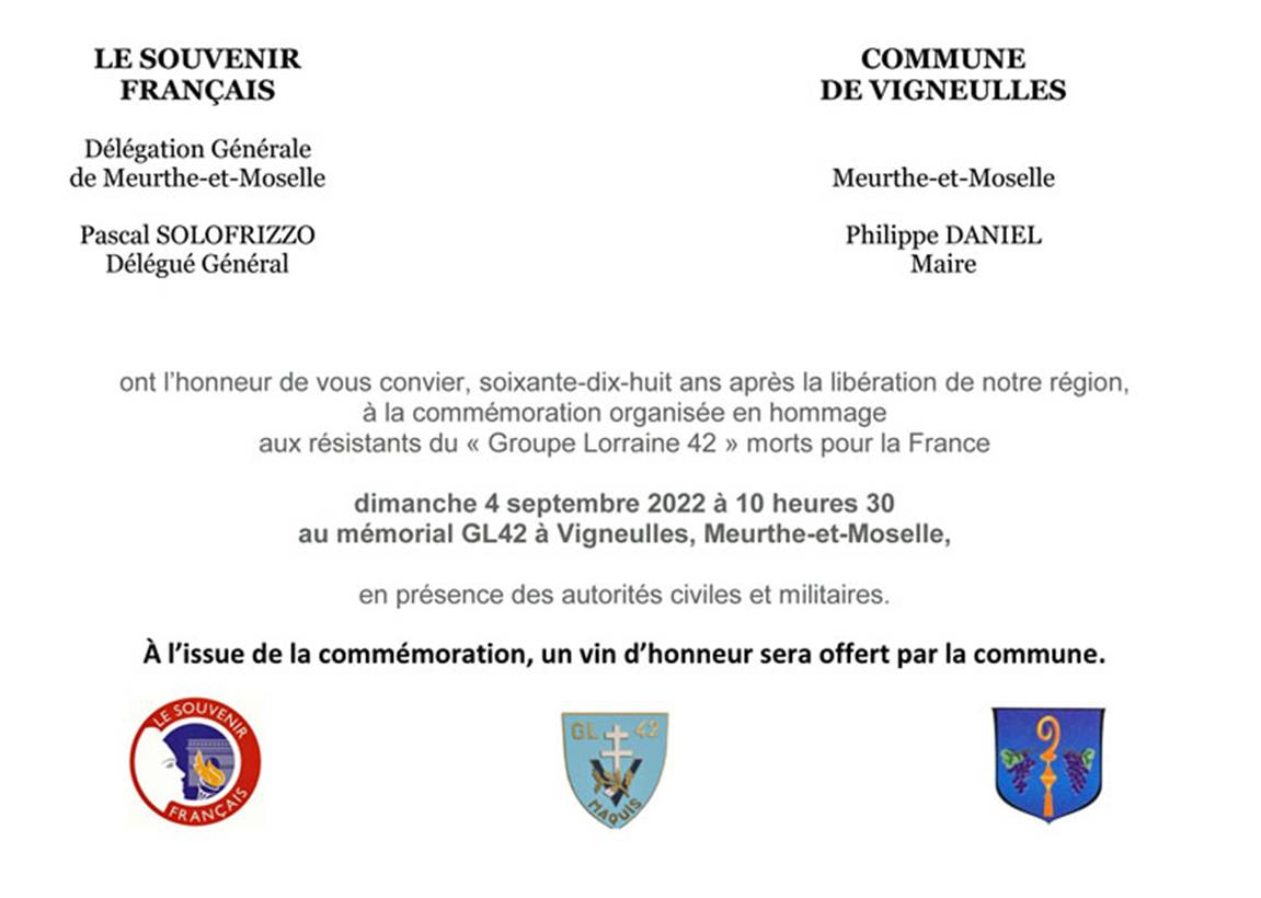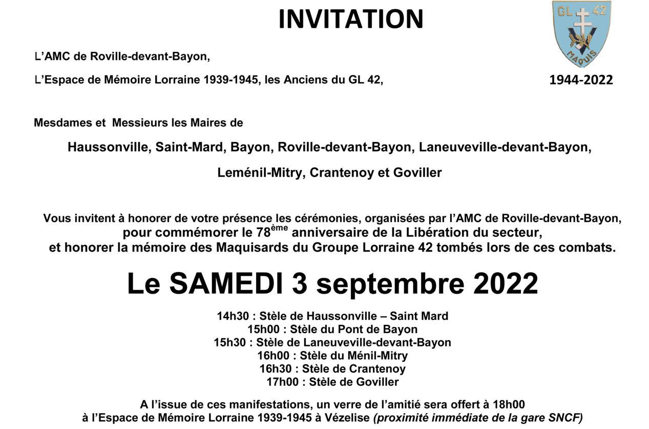 14h30 : stèle de Haussonville – Saint Mard 15h00 : stèle du Pont de Bayon 15h30 : stèle de Laneuveville-devant-Bayon 16h00 : stèle de Leménil-Mitry 16h30 : stèle de Crantenoy 17h00 : stèle de Goviller 18h00 : le verre de l’amitié sera partagé à l’Espace de Mémoire à Vézelise |