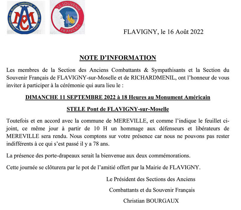 FLAVIGNY dimanche 11 septembre 2022 78ème anniversaire de la Libération 25ème anniversaire du monument Cérémonie au monument à 18h00 |