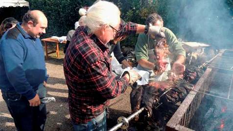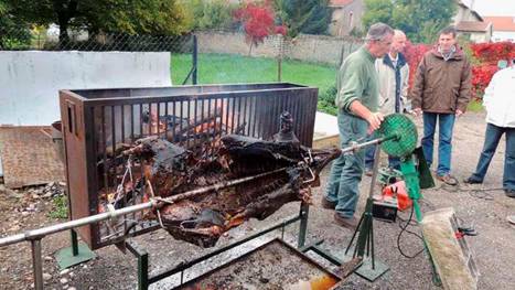 Il y a exactement un an, au cours du repas qui suivait l’inauguration de la plaque dédiée au jeune pilote tombé le 23 décembre 1944, Jean-Luc promettait que si son idée de donner le nom de Bradley Clark à une voie d’Omelmont était retenue, il offrirait un sanglier pour le repas, et Michel poursuivait en proposant de le cuire à la broche …