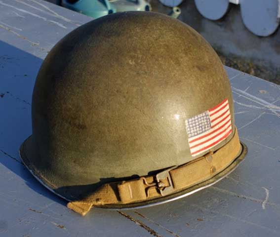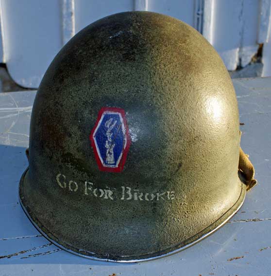 ![]() Superbe casque du 442nd Combat Team, offert à un restaurateur de Bruyères (88) en remerciement de son accueil en 1944, par un Vétéran de l’unité de retour dans les Vosges en 1945. Prêt de P. Charton |