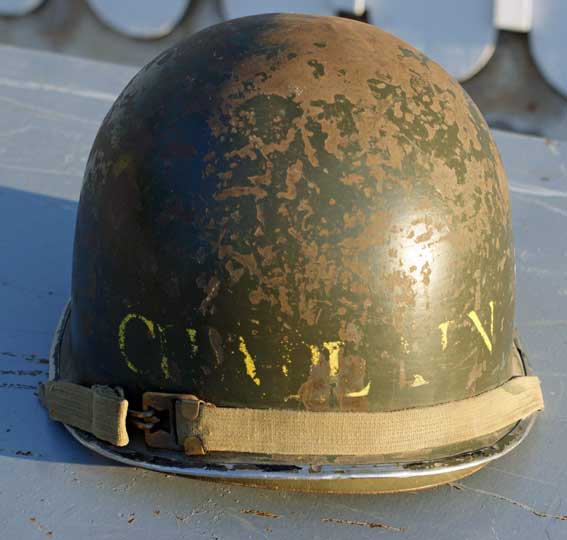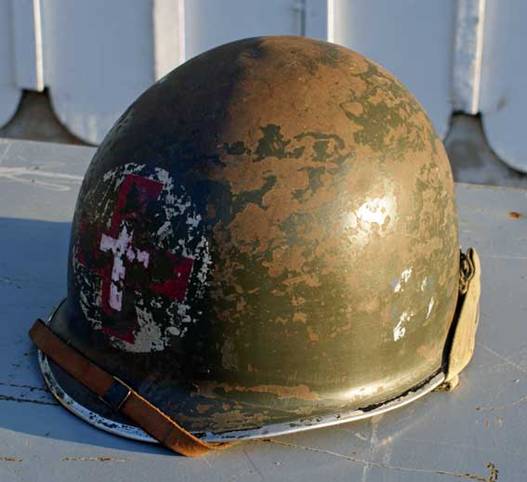 ![]() Superbe casque d’un « Chaplain » (aumônier), infirmier de la 3rd Infantry Division Rares marquages : la croix d’aumônier est peinte au centre de la croix rouge d’infirmier, la peinture du mot « Chaplain » est encore visible au dos |