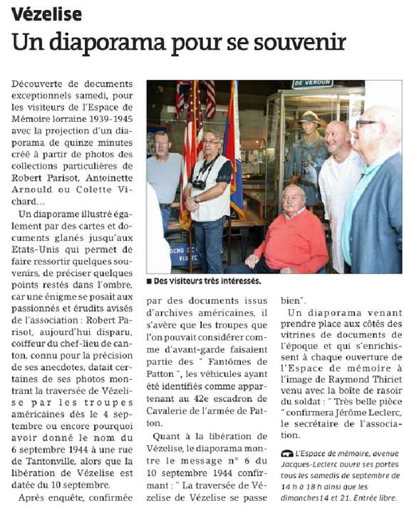 Pour le 70ème anniversaire de la Libération de Vézelise, et pour marquer l’évènement, l’association présentera dans l’Espace de Mémoire, durant tout le mois de septembre, un diaporama de 15 minutes, présentant plus de 70 photos prises entre le 4 septembre et la fin novembre 1944.