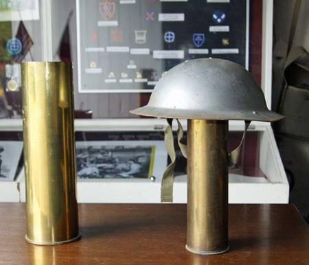 Cadeaux de Dédé Debonnet, ces deux douilles (75 et 105 mm) et un casque anglais