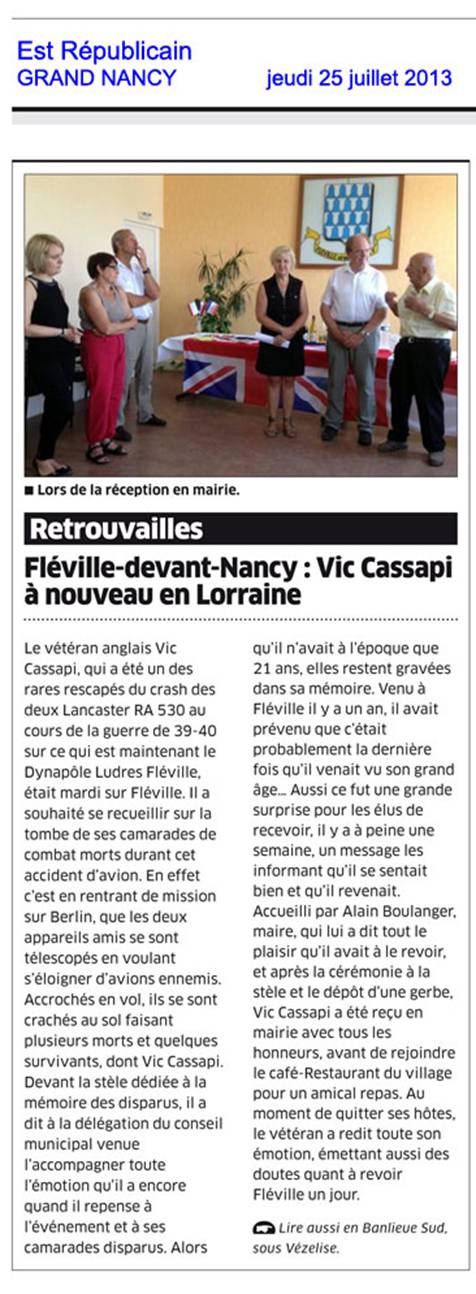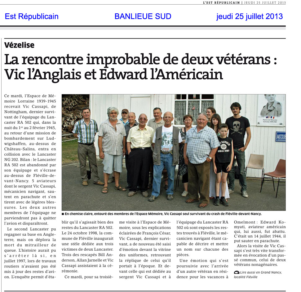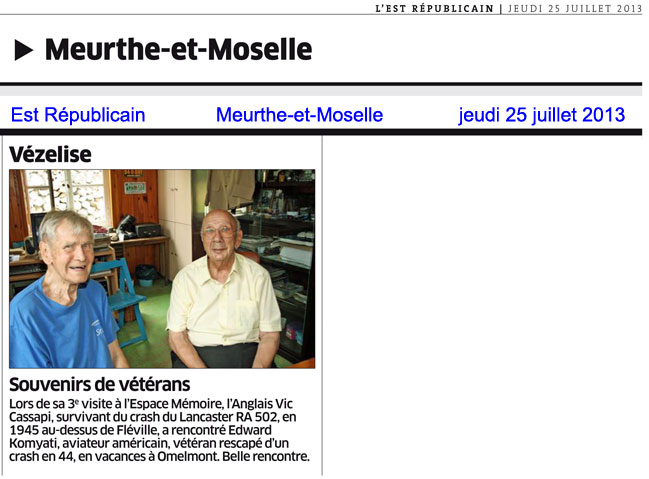 ![]() Ils ont sensiblement le même âge … un peu plus de 90 printemps… Tous deux étaient aviateurs durant la Seconde Guerre Mondiale, et tous deux ont sauté en parachute, Edward Komyati, Vétéran de l’USAAF, en juillet 1944, au dessus de la Birmanie, lors d’un vol de ravitaillement des « Tigres Volants », Vic Cassapi, Vétéran de la RAF, le 1er janvier 1945, au dessus de la Lorraine, au retour d’une mission de bombardement au dessus de l’Allemagne. Vic réside en Grande-Bretagne, Edward habite aux Etats-Unis, C’est à Vézelise dans l’Espace de Mémoire qu’ils se sont rencontrés, et qu’ils ont évoqué leurs souvenirs de guerre ! Tous deux n’ont pas envie que la journée se termine…