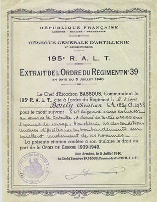 - il s’engage le 14 avril 1938 au 184ème R.A.L.T. (Régiment d'Artillerie Lourde Tractée) 4e Batterie à Valence. Nommé Brigadier le 20/10/1938 puis Brigadier Chef le 16/04/1939. - Affecté au 195ème R.A.L.T. (Régiment d'Artillerie Lourde Tractée) 7e Batterie le 03/09/1939. Nommé Maréchal des Logis le 16/03/1939. ![]() Képi de Christian BOULY (195ème R.A.L.T.) |