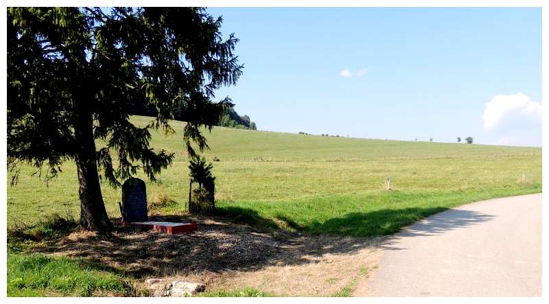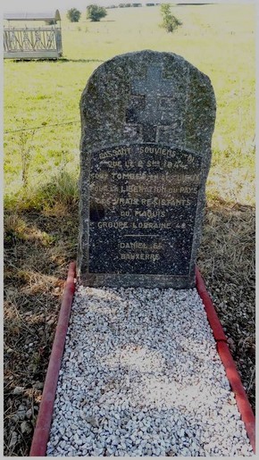 Depuis le panneau GOVILLER, en venant de Vezelise, à 500 métres à droite, prendre la rue de Cobarial et suivre sur 1km800. Stèle érigée en mémoire du Sous-lieutenant Daniel tombé le 2 septembre 1944, à proximité du terrain de parachutage « Jaquette ». ![]() |