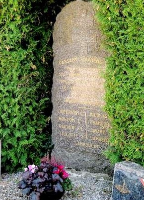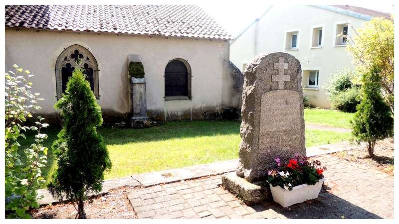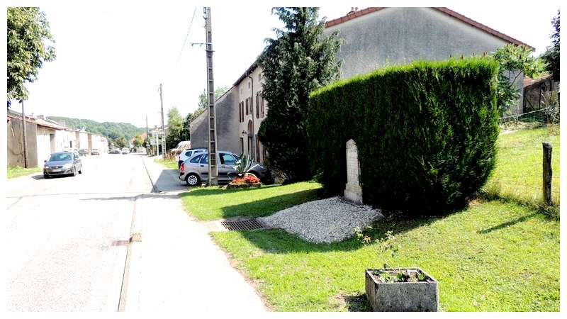 HAUSSONVILLE, en bordure de la RD 112, à gauche, entre Saint-Mard et Ferrières, peu avant le carrefour de Domptail-en-l’Air. Stèle érigée en mémoire de Jacques ADAM et Paul EURIAT fusillés le 4 septembre 1944 |