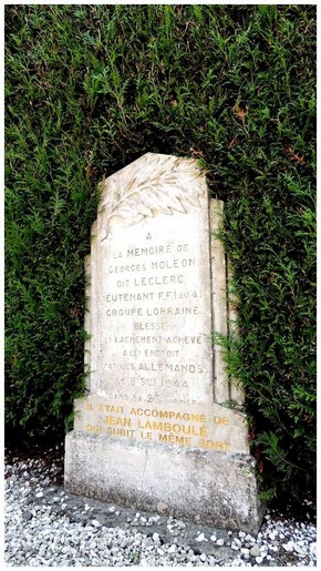 LANEUVEVILLE-DEVANT-BAYON, en bordure de la RD 9, à droite en arrivant de Crantenoy, venant de Vezelise. Stèle érigée en mémoire du Lieutenant Leclerc tombé le 9 septembre 1944. ![]() |