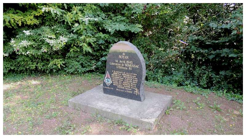 Sur le sentier menant au Mémorial, a été ajoutée en 2004, la réplique de la stèle de Semussac, érigée en mémoire des 15 Lorrains du 1/150ème R.I., issu du GL 42, tombés le 14 avril 1945, lors des combats pour la Libération de la Poche de Royan |
