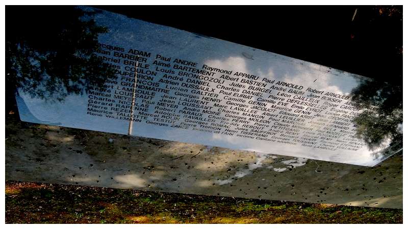 VIGNEULLES (54), prendre à gauche la route de Vigneulles, depuis la RD 116 reliant Saffais à Rosières-aux-Salines. Inauguré en 1994, le Mémorial de VIGNEULLES rappelle que 93 hommes du G.L. 42 ont donné leur vie pour la Libération de la France, tant au sein du maquis que du 1/150 R.I. : 51 tués au combat, 6 fusillés, et 36 morts en déportation. Les noms de ces 93 « Soldats de l’Ombre » sont gravés dans un bloc de granit poli. |